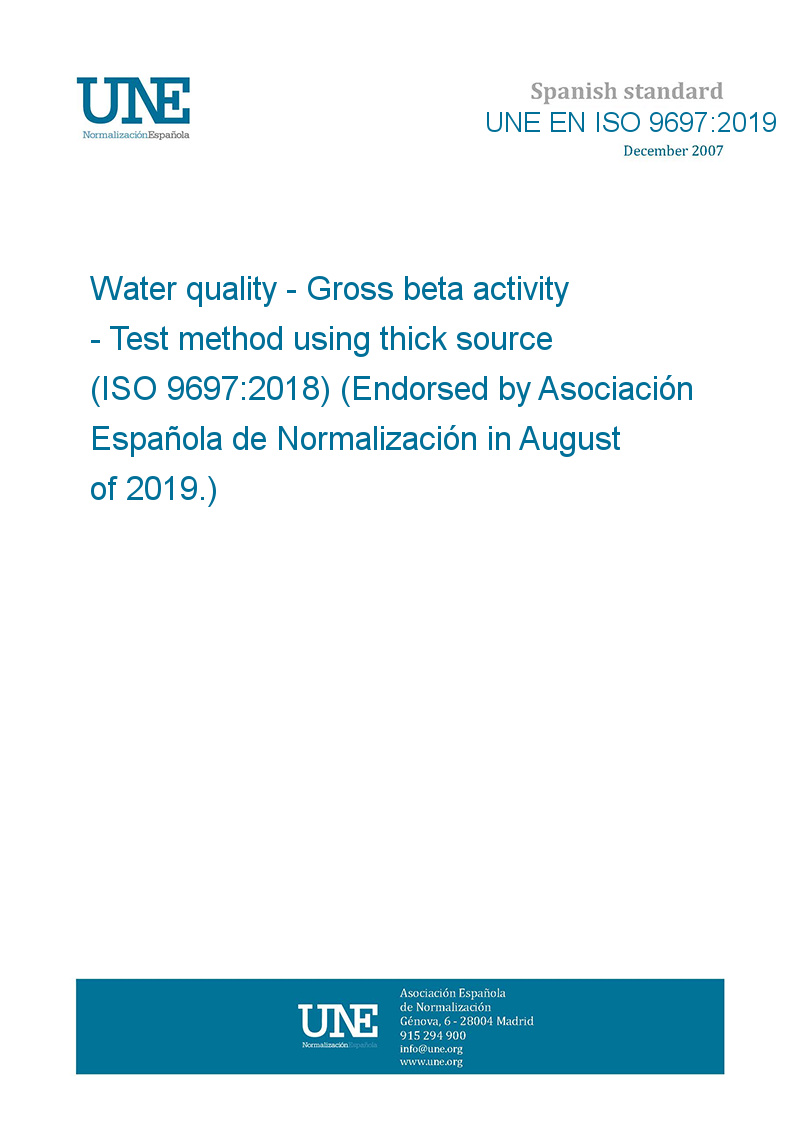Water quality - Gross beta activity - Test method using thick source (ISO 9697:2018) (Endorsed by Asociación Española de Normalización in August of 2019.)