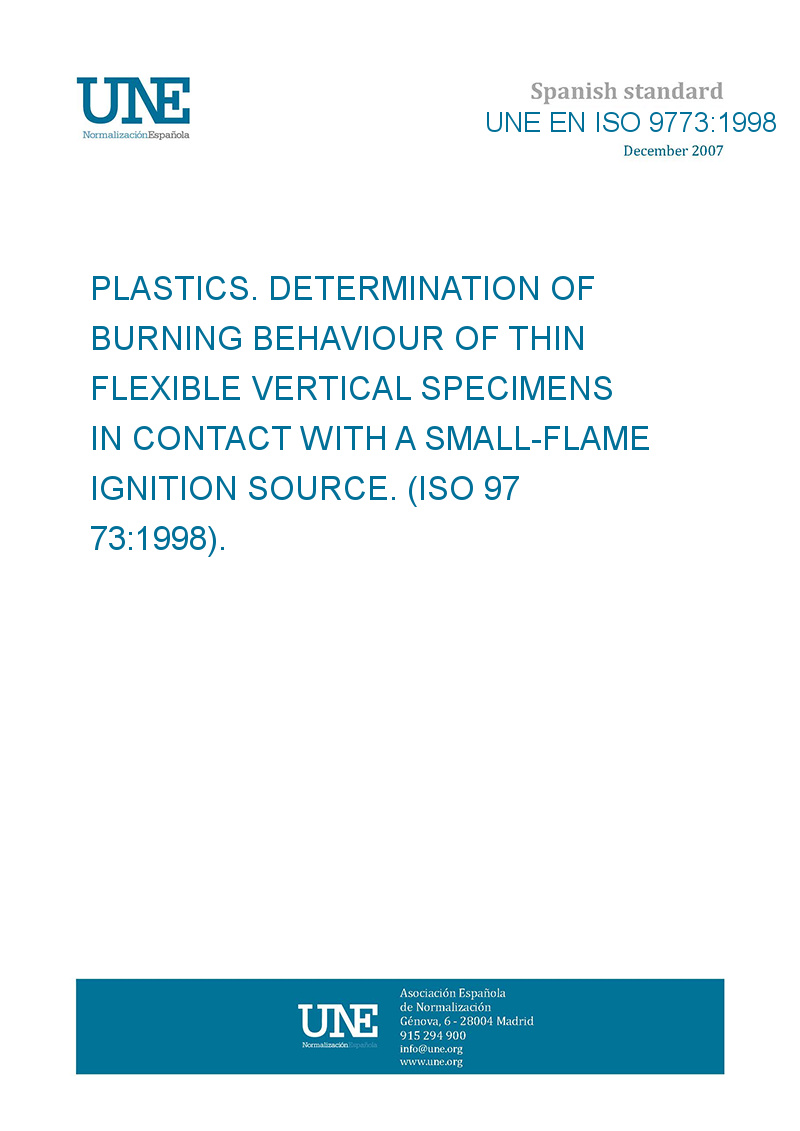 Plásticos. Determinación del comportamiento al fuego de probetas verticales delgadas y flexibles en contacto con una llama pequeña como fuente de ignición. (ISO 9773:1998).