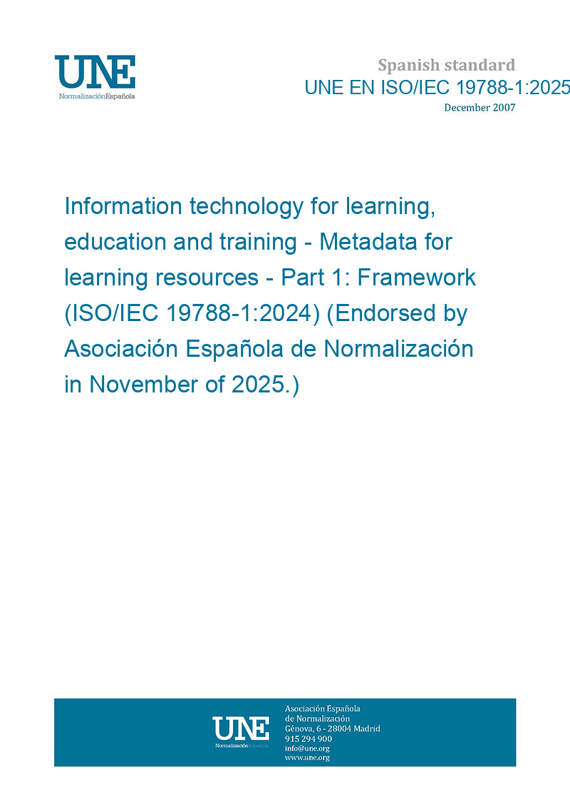 Tecnologías de la información. Aprendizaje, educación y formación. Metadatos para recursos de aprendizaje. Parte 1: Marco (ISO/IEC 19788-1:2024) (Ratificada por la Asociación Española de Normalización en noviembre de 2025.)