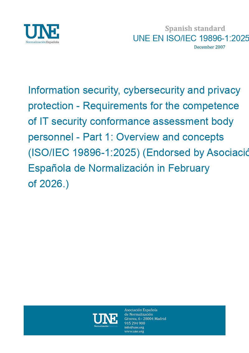 Information security, cybersecurity and privacy protection - Requirements for the competence of IT security conformance assessment body personnel - Part 1: Overview and concepts (ISO/IEC 19896-1:2025) (Endorsed by Asociación Española de Normalización in February of 2026.)