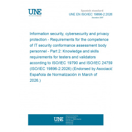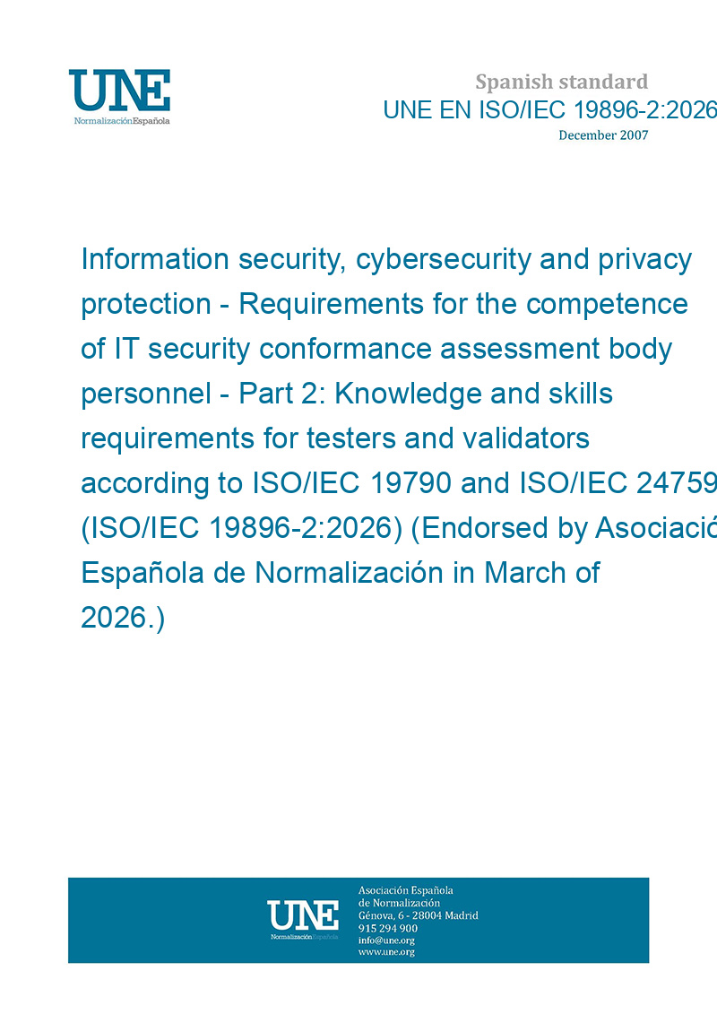 Information security, cybersecurity and privacy protection - Requirements for the competence of IT security conformance assessment body personnel - Part 2: Knowledge and skills requirements for testers and validators according to ISO/IEC 19790 and ISO/IEC 24759 (ISO/IEC 19896-2:2026) (Endorsed by Asociación Española de Normalización in March of 2026.)