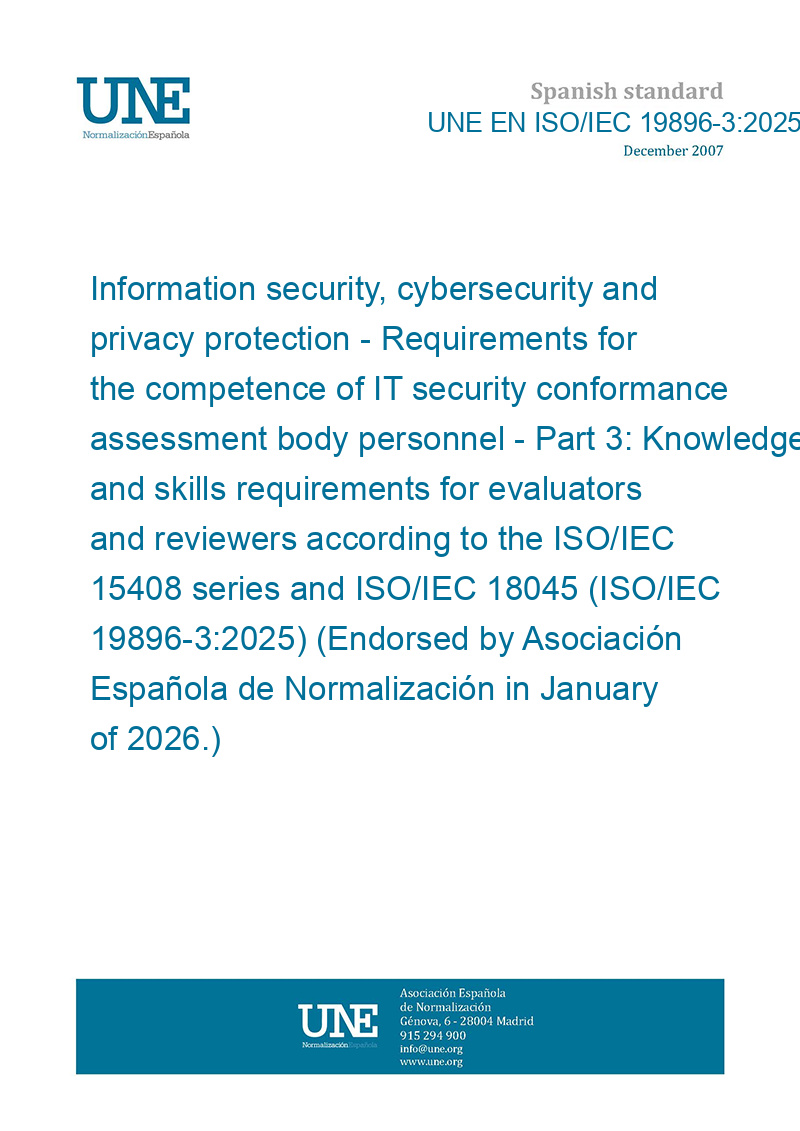 Information security, cybersecurity and privacy protection - Requirements for the competence of IT security conformance assessment body personnel - Part 3: Knowledge and skills requirements for evaluators and reviewers according to the ISO/IEC 15408 series and ISO/IEC 18045 (ISO/IEC 19896-3:2025) (Endorsed by Asociación Española de Normalización in January of 2026.)