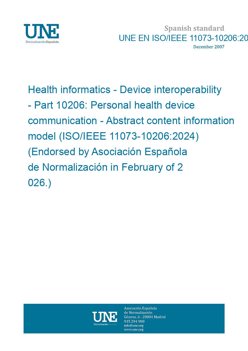Health informatics - Device interoperability - Part 10206: Personal health device communication - Abstract content information model (ISO/IEEE 11073-10206:2024) (Endorsed by Asociación Española de Normalización in February of 2026.)
