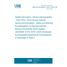 Health informatics - Device interoperability - Part 10701: Point-of-care medical device communication - Metric provisioning by participants in a Service-oriented Device Connectivity (SDC) system (ISO/IEEE 11073-10701:2024) (Endorsed by Asociación Española de Normalización in November of 2025.)